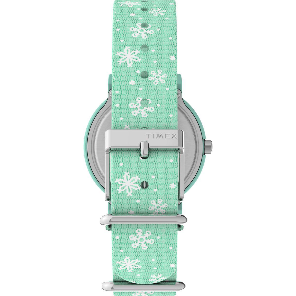 This Womens Timex(R) Color Rush Peanuts holiday watch is the perfect accessory to wear to holiday parties or a thoughtful gift for the Peanuts fan in your life. With its charmingfabric strap featuring a winter white snowflake pattern and adial showcasing Snoopy's doghouse decked out for the holidays, this timepiece is sure to delight all season long. Style: TW2W24700JT Case Dimensions: 34mm.