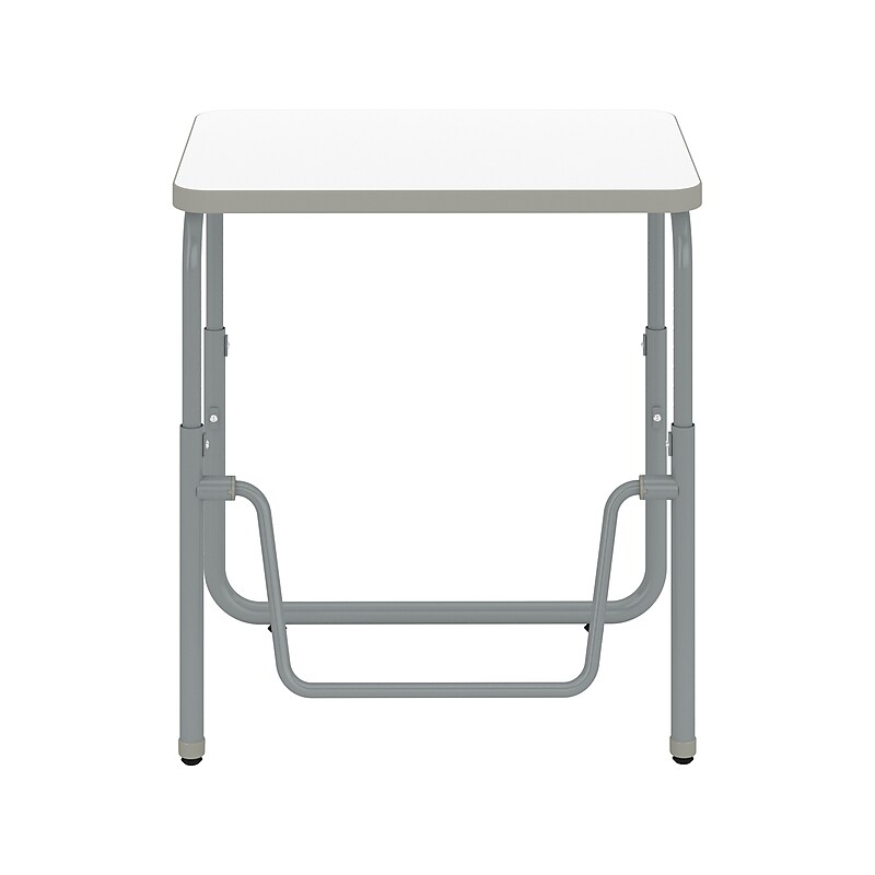Keep students active while they learn with this versatile sit-to-stand Safco AlphaBetter heightadjustable student desk. A pendulum footrest allows students to redirect excess energy and continue to move, even as they sit, providing ergonomic support, increasing comfort, and promoting cardiovascular health. Great for boosting productivity and focus, this student desk has the added benefit of optional casters for better mobility throughout the classroom. The 22"-30" desk accommodates K-12th grade students, as well as adults, at seated height, and K-4th grade students at standing height. Versatile sit-to-stand height-adjustable student desk comfortably accommodates students as they work or sketch ideas. Durable, clean design with powder-coated steel frame and high-pressure dry-erase laminate with 3mm edge banding. Dimensions: 22"-30"H x 27. 75"W x 19. 75"D. Meets or exceeds GREENGUARD standard. Assembly required. Features a pendulum footrest, providing ergonomic support, increasing comfort, and promoting cardiovascular health. Highly flexible with adjustable nylon glides, optional casters, and adjustable desktop. Accommodates K-12th grade students, as well as adults, at seated height and K-4th grade students at standing height. Health-positive design with height adjustability and pendulum footrest promotes constant movement.