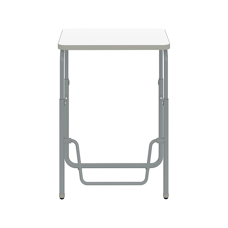 Help students stay productive and focused with the Safco AlphaBetter height-adjustable student desk. This desk comfortably accommodates students as they work or sketch ideas. A pendulum footrest allows students to redirect excess energy and continue to move, even as they sit, providing ergonomic support, increasing comfort, and promoting cardiovascular health. Great for active classroom environments, this student desk has the added benefit of optional casters for better mobility throughout the classroom. The 29"-43" desk accommodates students in 5th grade and up, along with adults, at seated and standing heights. Versatile sit-to-stand height-adjustable student desk comfortably accommodates students as they work or sketch ideas. Durable, clean design with powder-coated steel frame and high-pressure dry-erase laminate with 3mm edge banding. Dimensions: 29"-43"H x 27. 75"W x 19. 75"D. Meets or exceeds GREENGUARD standard. Assembly required. Features a pendulum footrest, providing ergonomic support, increasing comfort, and promoting cardiovascular health. Highly flexible with adjustable nylon glides, optional casters, and adjustable desktop. Accommodates students in 5th grade and up, along with adults, at seated and standing heights. Health-positive design with height adjustability and pendulum footrest promotes constant movement.