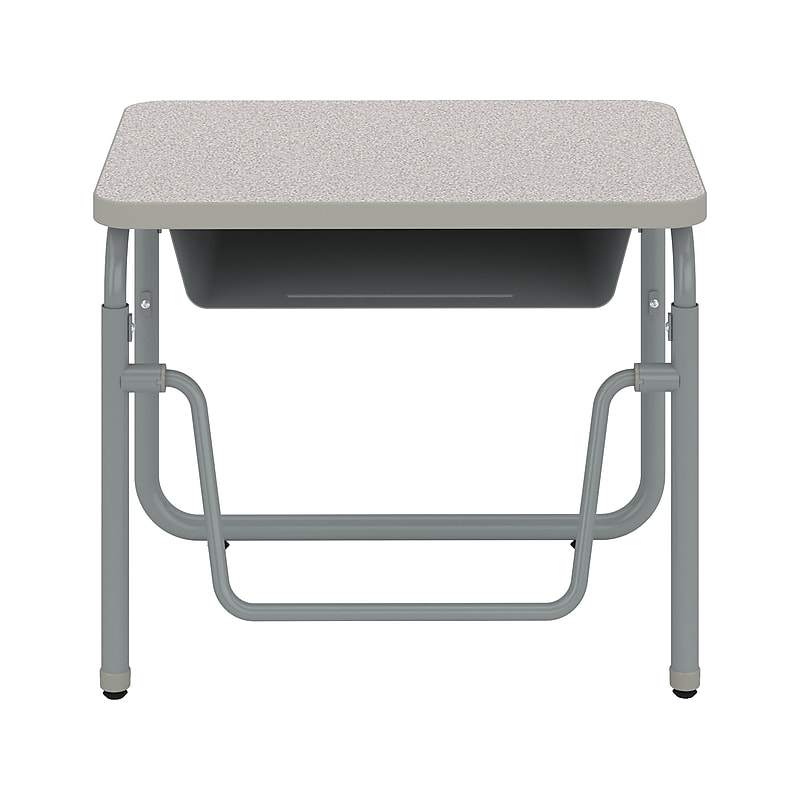 Help students stay organized and healthy with the Safco AlphaBetter height-adjustable student desk with a book box and pendulum bar. This desk comfortably accommodates students as they work or sketch ideas. The pendulum footrest allows students to redirect excess energy and continue to move, even as they sit, providing ergonomic support, increasing comfort, and promoting cardiovascular health. Great for boosting productivity and focus, this student desk has the added benefit of optional casters for better mobility throughout the classroom, and a convenient book cubby right beneath the desktop. The 22"-30" desk accommodates K-12th grade students, as well as adults, at seated height, and K-4th grade students at standing height. Versatile sit-to-stand height-adjustable student desk comfortably accommodates students as they work or sketch ideas. Durable, clean design with powder-coated steel frame and high-pressurelaminate with 3mm edge banding. Dimensions: 22"-30"H x 27. 75"W x 19. 75"D. Store books and personal items with book box beneath the desktop. Meets or exceeds GREENGUARD standard. Assembly required. Features a pendulum footrest, providing ergonomic support, increasing comfort, and promoting cardiovascular health. Highly flexible with adjustable nylon glides, optional casters, and adjustable desktop. Accommodates K-12th grade students, as well as adults, at seated height and K-4th grade students at standing height. Health-positive design with height adjustability and pendulum footrest promotes constant movement.