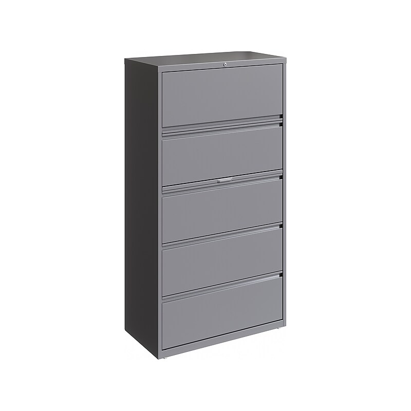 This 36 in. wide 5 drawer commercial grade lateral filing cabinet is designed for heavy duty use, yet looks great in any office. Precision ball-bearing suspension allows for quiet use in your busy office environment. Fully assembled steel construction with reinforced base. Non-porous surface is easy to clean. Interlock system prevents tipping by only allowing one drawer open at a time. Dual lock bars and core-removable lock come standard. The top drawer features a roll-out shelf designed to accommodate 3-ring binders. Unit includes hang rails, magnetic label holders, posting shelf, and four adjustable leveling glides. Greenguard Gold certified for indoor air quality. Meets or exceeds ANSI-BIFMA standards. TAA compliant. Limited Lifetime Warranty. Five-drawer lateral file cabinet holds letter-, legal-, or A4-size documents. Comes and made of steel. Dimensions: 67. 63"H x 36"W x 18. 63"D. Commercial-grade ball bearing suspension allows fully loaded drawers to open with ease. Lock included. Drawer interlock system inhibits tipping over. Meets or exceeds ANSI/BIFMA, TAA, and GREENGUARD Gold standards. Ships fully assembled. Durable steel construction with nonporous surface is easy to clean and disinfect. Dual lock bars secure both sides of drawers. Full-width J-shaped pull handles. Unit includes hang rails, magnetic label holders, and four adjustable leveling glides. Lifetime manufacturer limited warranty. Discover ultimate organization with this commercial grade lateral filing cabinet: designed to elevate your office while providing functionality. Safety is paramount with an interlock system to prevent tipping and a core-removable lock for secure storage. Certified greenguard gold for indoor air quality and backed by a limited lifetime warranty.