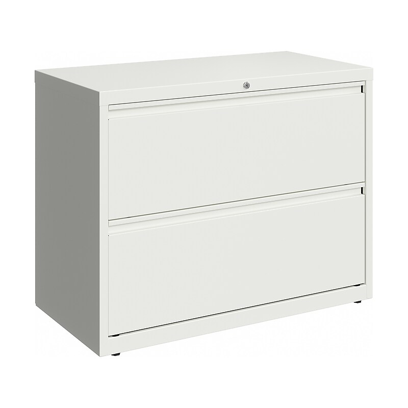 This 36 in. wide 2 drawer commercial grade lateral filing cabinet is designed for heavy duty use, yet looks great in any office. Precision ball-bearing suspension allows for quiet use in your busy office environment. Fully assembled steel construction with reinforced base. Non-porous surface is easy to clean. Interlock system prevents tipping by only allowing one drawer open at a time. Dual lock bars and core-removable lock come standard. Unit includes hang rails, magnetic label holders, and four adjustable leveling glides. Greenguard Gold certified for indoor air quality. Meets or exceeds ANSI-BIFMA standards. TAA compliant. Limited Lifetime Warranty. Two-drawer lateral file cabinet holds letter-, legal-, or A4-size documents. Comes and made of steel. Dimensions: 28"H x 36"W x 18. 63"D. Commercial-grade ball bearing suspension allows fully loaded drawers to open with ease. Lock included. Drawer interlock system inhibits tipover. Meets or exceeds ANSI/BIFMA and GREENGUARD Gold standards. Ships fully assembled. Durable steel construction with nonporous surface is easy to clean and disinfect. Dual lock bars secure both sides of drawers. Full-width J-pull handles. Unit includes hang rails, magnetic label holders, and four adjustable leveling glides. TAA compliant. Lifetime manufacturer limited warranty. Discover ultimate organization with this commercial grade lateral filing cabinet: designed to elevate your office while providing functionality. Safety is paramount with an interlock system to prevent tipping and a core-removable lock for secure storage. Certified greenguard gold for indoor air quality and backed by a limited lifetime warranty.