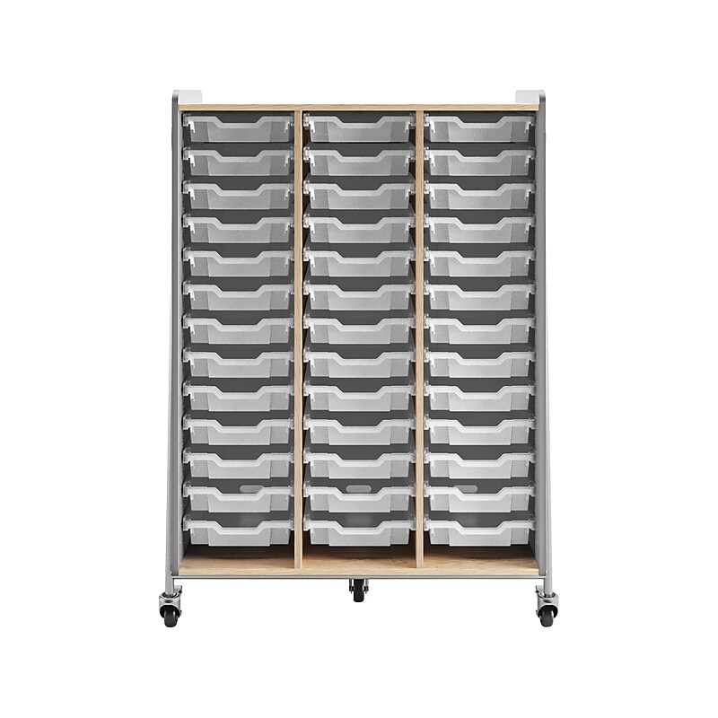 Have easy access to well-organized supplies with the Whiffle Typical 12 60"H triple-column mobile storage cart. Easy-to-remove 3"H totes are tough enough to withstand the rigors of any environment while providing ample space for storage. The multifunctional mobile design features a laminate work surface and a magnetic, dry-erase laminate back, so you can use it to house a laptop or display ideas. Once you're done, simply roll it out of way on the unit's heavy-duty swiveling casters, which lock into place for safety. Mobile, versatile triple-column storage is perfect for classroom, makerspace, or office. Made of 0. 75" thick particleboard with thermally fused laminate (TFL) on both sides and comes Dimensions: 60"H 43. 25"W 19. 75"D. Assembly required. Includes an HPL work surface, magnetic, dry-erase laminate on the back, and storage. Designed for durability with a powder-coated frame, 2mm PVC edge banding on side panels and top work surface, and 1mm PVC edge banding on remaining parts. Helps you stay organized with 39 3"H totes (13 in each column). Allows for mobility with four heavy-duty, 360-degree swivel casters, two locking and two non-locking. Provides cable management with three grommet holes at the bottom of the unit. Bin dimensions: 3"H 12. 25"W 16. 75"D. ⚠ WARNING: This product can expose you to chemicals including Di(2-ethylhexyl) phthalate (DEHP), which is known to the State of California to cause cancer or birth defects or other reproductive harm. For more information go to www. P65Warnings. ca. gov/furniture.