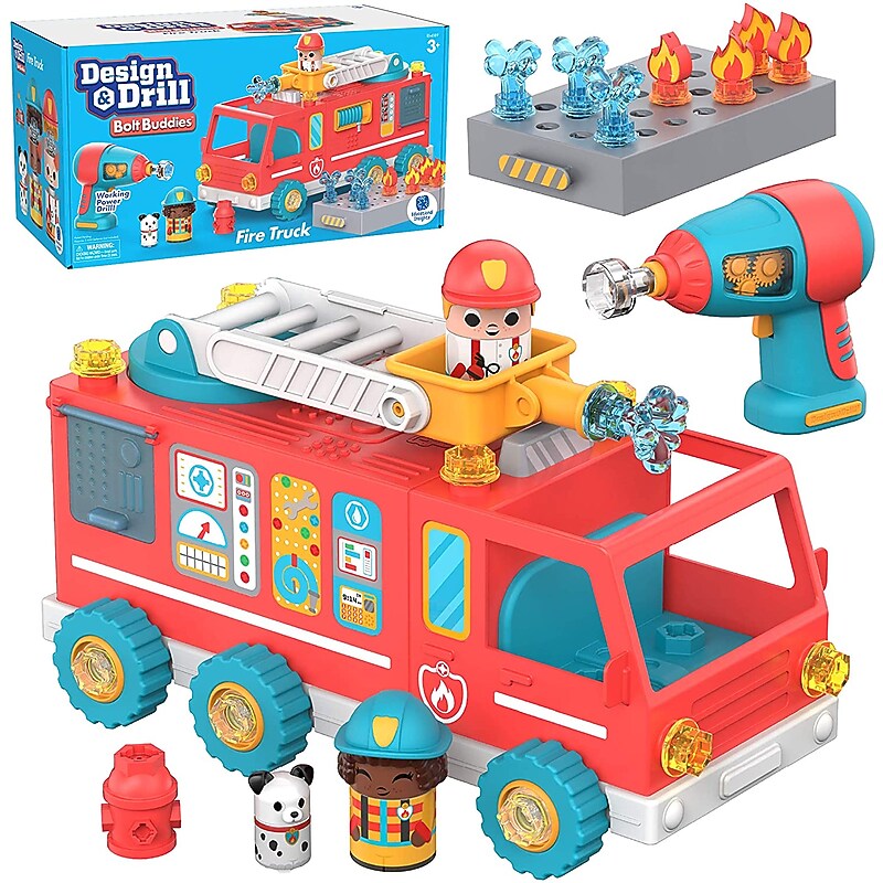 Welcome to the world of Educational Insights Design & Drill Bolt Buddies, where your little one learns the basics of simple construction and engineering while building fine motor skills with tools designed to be just right for tiny hands. Psst They're learning. Supports STEM learning. Builds fine motor skills, inspires imagination and creativity. Fire truck that helps your child learn the basics of simple construction and engineering. Comes multicolored. Dimensions: 13. 7"H x x 13. 8"W x 2. 6"D. Includes kid-friendly power drill, fire truck body with retractable drill board and liftable ladder, 24 colorful bolts, eight snap-on fire-and-water toppers, Bolt Buddy Fire Chief, Firefighter, and dalmatian dog pal figurine. Drill requires three AAA batteries (not included). Great for hours of unplugged playtime.