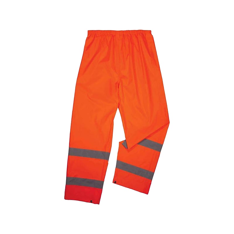 The Ergodyne Glowear 8916 lightweight high-visibility rain pants are Class E pants that provide protection against wet conditions while ensuring safety. An elastic waistband enables comfort to wear alone or over a base layer, with snap cuffs for easy on/off over boots. Built for demanding conditions, these pants are made with rugged yet lightweight waterproof materials and are fully taped at the seams for reliable protection in stormy weather. 2" reflective tape keeps workers highly visible at night or in low-light conditions. Made of lightweight 150D polyester Oxford fabric with a polyurethane coating, comes in brightcolor. Size: M. Designed for the industrial workplace and workers in low-light environments, flagging crews, utility crews, road construction, railway workers, and any others working in the rain. Offers fully taped and bonded seams locking out water. Features comfortable and flexible waistband, can be worn as the second layer or over the base layer. Pant legs easily fit over boots with two-stage button snaps to keep the wind out. Bright fluorescent fabric increases visibility in the daylight. 2" silver reflective tape reflects light, such as car headlights, for visibility in the dark. Meets or exceeds ANSI/ISEA 107-2015 Supplemental Class E, ANSI Type R Class 3 (when worn with Class 2 upper garment), and third-party standards. For a complete set of high-visibility rain gear add the Glowear 8366 lightweight high-visibility rain jacket. Care instructions: machine-washable.