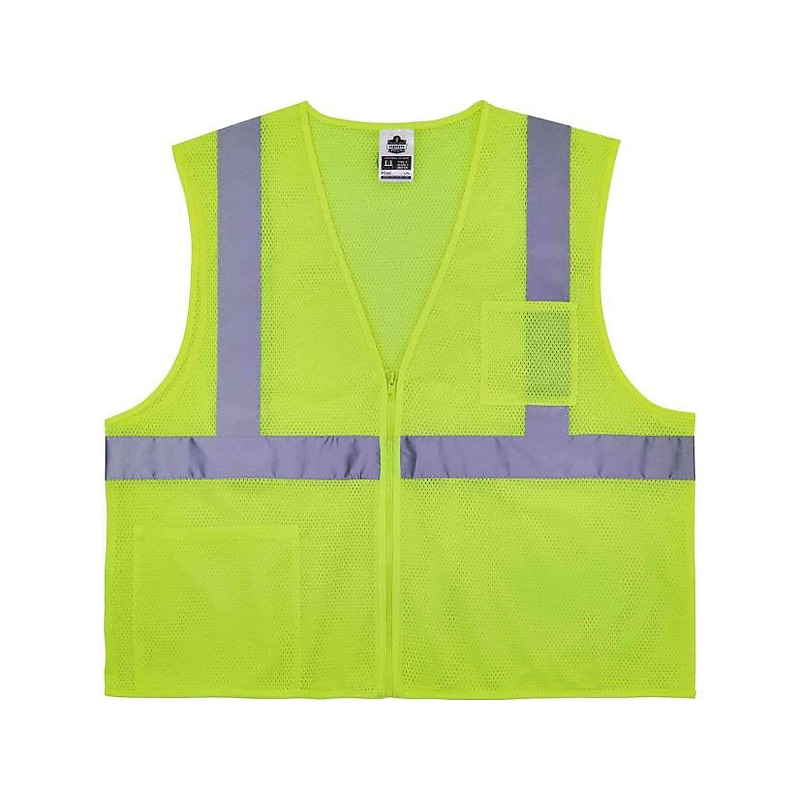Ergodyne GloWear 8256Z Class 2 self-extinguishing high-visibility safety vest is built with durable, yet breathable ANSI/ISEA compliant self-extinguishing treated polyester mesh to prevent after-flame while providing maximum visibility for any job, both day and night. This high-visibility safety vest has a total of two strategically placed pockets: an open top pocket on the upper left exterior chest designed to fit tape, pencils, cell phones, and more, and an additional pocket in the lower left interior great for tools, notebooks, gloves, and more. Designed with a treated 100% polyester material to meet ANSI/ISEA standards and to self-extinguish as defined by ASTM D6413 in less than 2 seconds, and have less than 6" of char length. This vest does not meet the ANSI/ISEA 107 standard for fire resistance and should not be worn where an arc flash or flash fire hazard is present. This reflective safety vest is great for welders or in work conditions where sparks are flying. Great for jobsites requiring high-visibility safety apparel with minimal flame-retardant qualities. Self-extinguishing high-visibility safety vest to prevent after-flame while providing maximum visibility for any job, both day and night. Built with durable, yet breathable ANSI/ISEA compliant self-extinguishing treated polyester mesh, comes Size: 4XL/5XL. Features two strategically placed pockets: an open-top pocket on the upper left exterior chest designed to fit tape, pencils, cell phones, and more, and an additional pocket in the lower left interior great for tools, notebooks, gloves, and more. Meets or exceeds ANSI/ISEA 107-2015 Type R Class 2 and ASTM D6413 standards. ANSI compliant 2" wide reflective tape adds visibility. Features easy on/off front zipper closure.