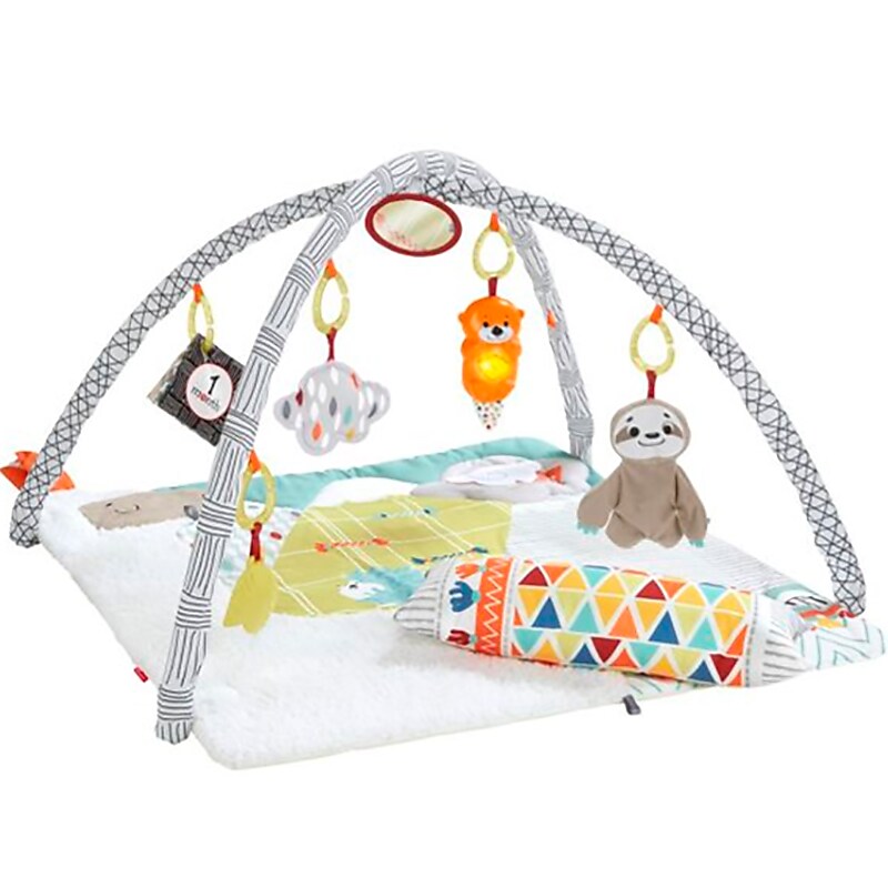 Delight all five of your baby's senses with the otter-ly engaging Fisher-Price Perfect Sense deluxe gym. Its super cozy play mat with supportive tummy-time wedge is the perfect spot for your little explorer to embark on a sensory adventure. From the lights and music of the friendly otter, to the chewy leaf teether, plush sloth lovey, scented cloud and more, there's so much for your baby to discover on this deluxe infant play gym. There's even a fold-out milestone panel for those monthly photo-opps. Where development comes into play: features sights, sounds, textures, and more. This infant gym is packed with sensory-stimulating play for your baby to discover. The silly animal pals overhead encourage your baby to reach and bat during lay-and-play time, strengthening their gross motor skills. Grasping the toys and bringing the teether to their mouth for chewy fun helps strengthen your baby's hand-eye coordination and dexterity. Plush sensory-stimulating infant activity gym for babies from birth. Comes multicolored. Features 20 sensory discoveries to engage all five of your baby's senses. Contains an extra-large machine-washable play mat with plush llama and tummy wedge and high-contrast toy arches. Includes six moveable toys with sensory elements: light-up musical otter, scented cloud, discovery mirror, leaf teether, plush sloth, and crinkly milestone panel. Item arrives in frustration-free, easy-to-open packaging that's 100% recyclable. Adult assembly is required.