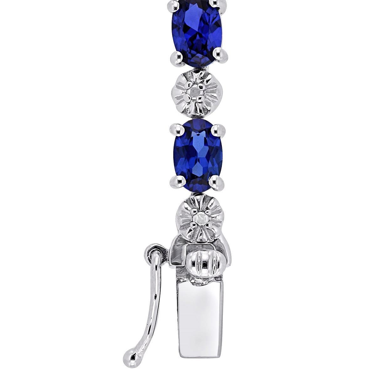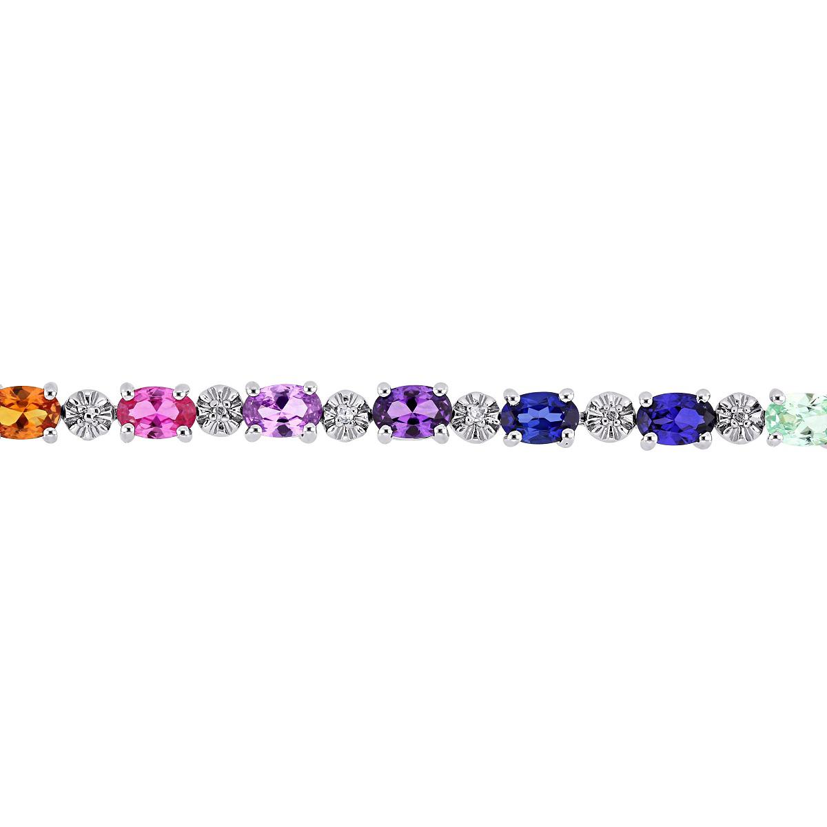 This Gemstone Classics(tm) multi-color sapphire and diamond accent tennis bracelet is crafted in lustrous sterling silver with a box clasp. It features a gorgeous selection of oval-cut created sapphires in a stunning array of colors along with two diamond accents in a delicate bracelet you can wear with anything.