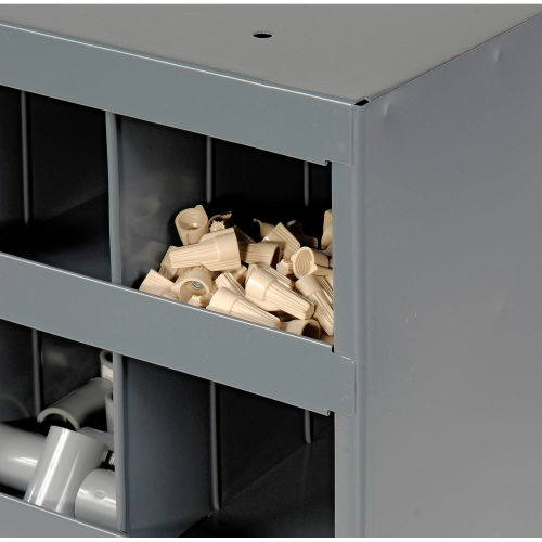 All Welded Parts Bin Unit without Doors This pre-assembled unit is manufactured with prime cold-rolled steel in a sturdy, all welded construction that will not warp, twist or sag. Bin fronts feature a 1-1/8"W hem to provide support and extra space for labels. Finished in a rust and acid resistant powder coat finish. Units stack to save floor space. Also available with doors.