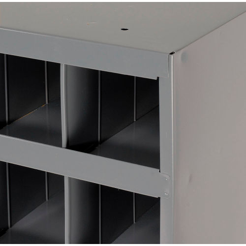 All Welded Parts Bin Unit without Doors This pre-assembled unit is manufactured with prime cold-rolled steel in a sturdy, all welded construction that will not warp, twist or sag. Bin fronts feature a 1-1/8"W hem to provide support and extra space for labels. Finished in a rust and acid resistant powder coat finish. Units stack to save floor space. Also available with doors.
