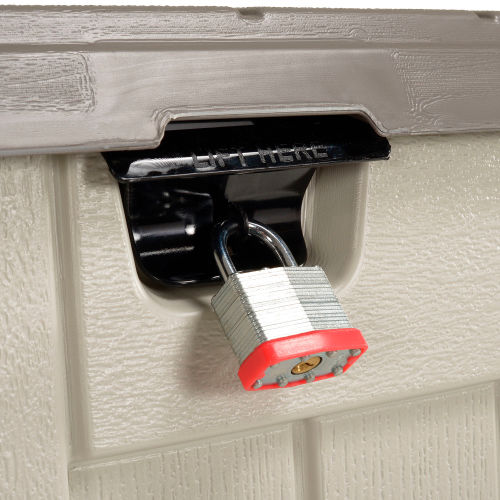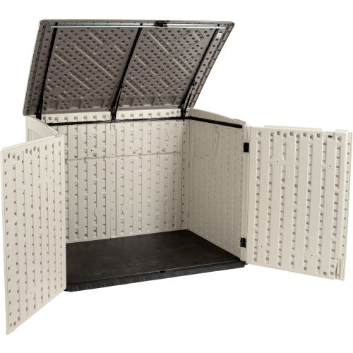 Suncast 70 Cubic Foot Stow-Away Horizontal Shed BMS4700 - 70-1/2"W x 44-1/2"D x 52"H 70 cubic Feet; Large enough to hold two 96-gallon garbage containers; Great for storing lawn and garden supplies and tools, smaller bicycles, patio cushions and more; Gas shocks make it easier to lift lid and keep it open; Multi-wall resin panels are engineered for strength and stability; Padlock-ready, 3-door locking system (lock not included); Ramp for easy wheeling in and out; Low-profile design is ideal for placement on the side of a house, patio, or under a fence line.