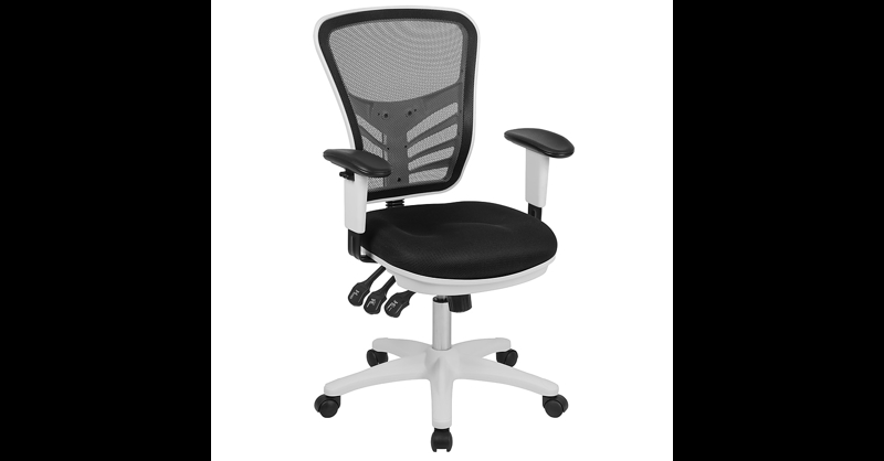 Get your work demands down to a minimum and produce your best work on this multifunctional swivel office chair. This chair comes fully loaded to help you take charge of your day. With a ventilated mesh back, you'll have air circulating to your back giving you sweet relief during warm summer days. Make room for this modern beauty, upgrade everyone's chair in the office, granting everyone the ability to have a customized seating experience. Standout features include: an adjustable back height knob; back angle paddle; tilt control paddle; curved back with substantial lumbar support; contour padded swivel seat; adjustable height arms provide relief to your neck and shoulders. Get a supportive ergonomic chair that can keep up with long 8 to 10 hour shifts with ease. This chair is so comfortable it can also be used as a gaming chair while you revel in an intense game against online players. Mesh Executive Office Chairs. Color:Mesh/White Frame; Material: Foam, Mesh, Metal, Plastic, Plywood, Polyester. Ergonomic - Adjustable Built-in Lumbar Support. Overall Dimensions: 25. 5"W x 24. 5" - 27"D x 37" - 44. 25"H. Seat Dimensions: 19" - 24"H x 19. 5"W x 18"D. Back Dimensions: 14"W x 18. 5"H. Adjustable Arms. Rated for up to 300 lbs Based on 6-8 Hours Use. Care Instructions: SW-Solvent and water based cleaner such as foam. Assembly Required. ANSI/BIFMA compliant for safety. Warranty: 2 Years Limited. Contemporary Executive Office Chair with Height Adjustable Padded Arms. Mid-Back Design with breathable mesh material. Built-In Lumbar Support. Back Height Adjustment Knob positions the lumbar support to reduce back pain. Infinite-Locking Back Angle Adjustment helps reduce disc pressure by changing the angle of your torso. Multi-Tilt Lock Mechanism rocks/tilts and locks the chair in infinite positions. Tilt Tension Adjustment Knob adjusts the chair's backward tilt resistance. ContouredMesh Upholstered Seat with CAL 117 Fire Retardant Foam. Pneumatic Seat Height Adjustment. 5-Star White Nylon Base with Dual-Wheel Casters. Revamp your office space with a ventilated mesh office chair that will make a great addition in modern and industrial spaces.