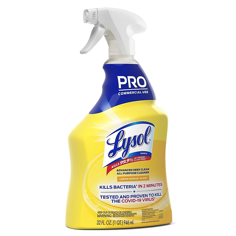 The advanced deep clean all-purpose cleaner destroys grease and grime with ease. Designed for commercial use, Lysol Professional Advanced Deep Clean All Purpose Cleaner can help you deep clean, disinfect, and degrease high-touch surfaces all in one product. Drive operational efficiency with the convenient trigger spray bottle and a solution that offers efficient cleaning and disinfecting at the same time. Cut through stubborn stains and spills using this advanced multi-purpose cleaner. Lysol kills 99. 9% of germs and viruses (including the virus that causes COVID-19) when used as directed on hard, non-porous surfaces. Kills 99. 9% of viruses and bacteria, including cold and flu viruses, Salmonella, E. Coli, H1N1, and Herpes Simplex Virus Type 1 and 2 when used as directed. Proven to kill the virus that causes COVID-19 in 2 minutes when used as directed. Power through tough stains and kill germs on high-touch surfaces, restroom fixtures, including counters, desks, chairs and appliance exteriors. Formulated for safety standards: Meets OSHA bloodborne pathogen standards. Uphold sustainability goals with a bottle made of 25% post-consumer recycled plastic. Optimize your cleaning practices with the ergonomic trigger spray bottle and the advanced, all purpose cleaner that offers superior grease cutting performance (compared to Lysol All Purpose Cleaner Trigger Lemon Breeze). Remove tough odors in your facility with a pleasant Lemon Breeze scent and formula that supports a more hygienic commercial environment. Safety Data Sheet . Help cleaning staff power through tough cleaning jobs with superior grease cutting performance (compared to Lysol All Purpose Cleaner Trigger Lemon Breeze).