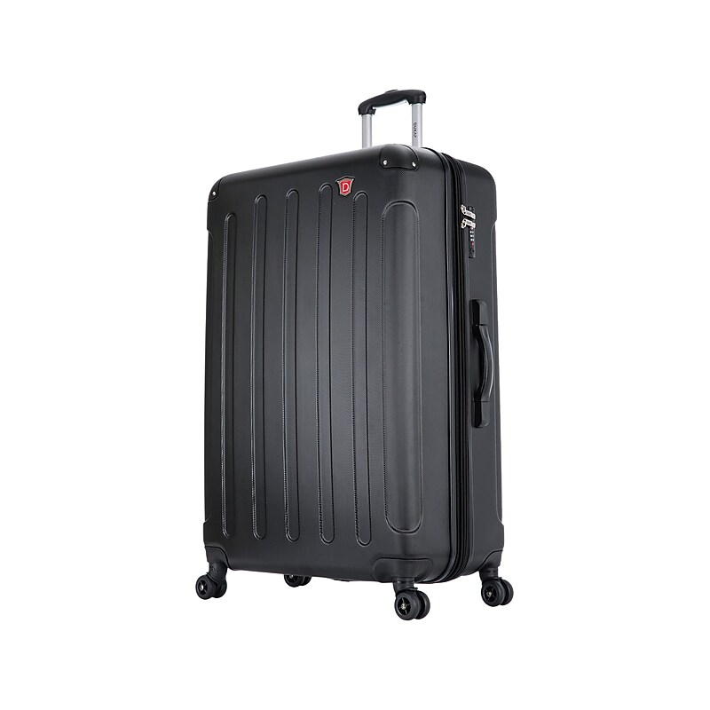 The hard-flex construction of this DUKAP INTELY luggage offers maximum strength, durability, and a water-/scratch-resistant finish. A full interior fabric lining with a zipper compartment on one side and snap-on straps on the opposite side allows for easy packing. It also features one inside mesh zipper pocket and two slip pockets for shoes. Interior Measurements: 21"W x 12. 5"D x 32"H. Exterior Measurements: 23"W x 12. 5"D x 34"H. Made of lightweight PC/ABS engineered material with micro-diamond finish; comes Equipped with top and side ergonomic gel handles for comfortable and easy lifting. Offers full interior fabric lining with a zipper compartment on one side and snap-on straps on the opposite side for easy packing, plus one inside mesh zipper pocket and two slip pockets for shoes. Suitcase expands 1. 2'' for extra space. Hard-flex construction offers maximum strength, durability, and water-/scratch-resistant finish. Features four dual spinner 360-degree silent wheels for effortless mobility. Features push-button locking internal retractable trolley system. Smooth-gliding oversized zippers provide easy maintenance. Four side studs allow the luggage to stand upright. Includes built-in TSA-approved combination lock. Features integrated digital weight scale (batteries included). Protective corner bumpers to withstand higher impacts. Weight: 10. 7 lbs. 10-year manufacturer limited warranty. ⚠ WARNING: This product can expose you to chemicals known to the State of California to cause cancer, such as but not limited to acrylonitrile, butadiene, styrene, propylene, ethylene glycol, iron, butane, benzene and vinyl acetate. For more information, go to www. P65Warnings. ca. gov.