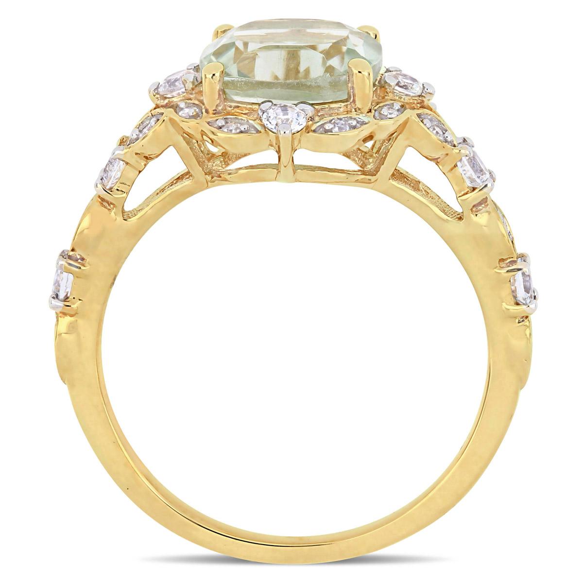 This exceptional Gemstones Classics(tm) green amethyst, white sapphire, and diamond ring is crafted in 14kt.and features a stunning large cushion-cut green amethyst stone set in a unique diamond and white sapphire studded vintage-inspired halo design. This gorgeous ring is perfect for a woman seeking elegance and class in her everyday look. A perfect gift choice for a special February birthday in your life. Stone color: White/Green Clarity: I2-I3.