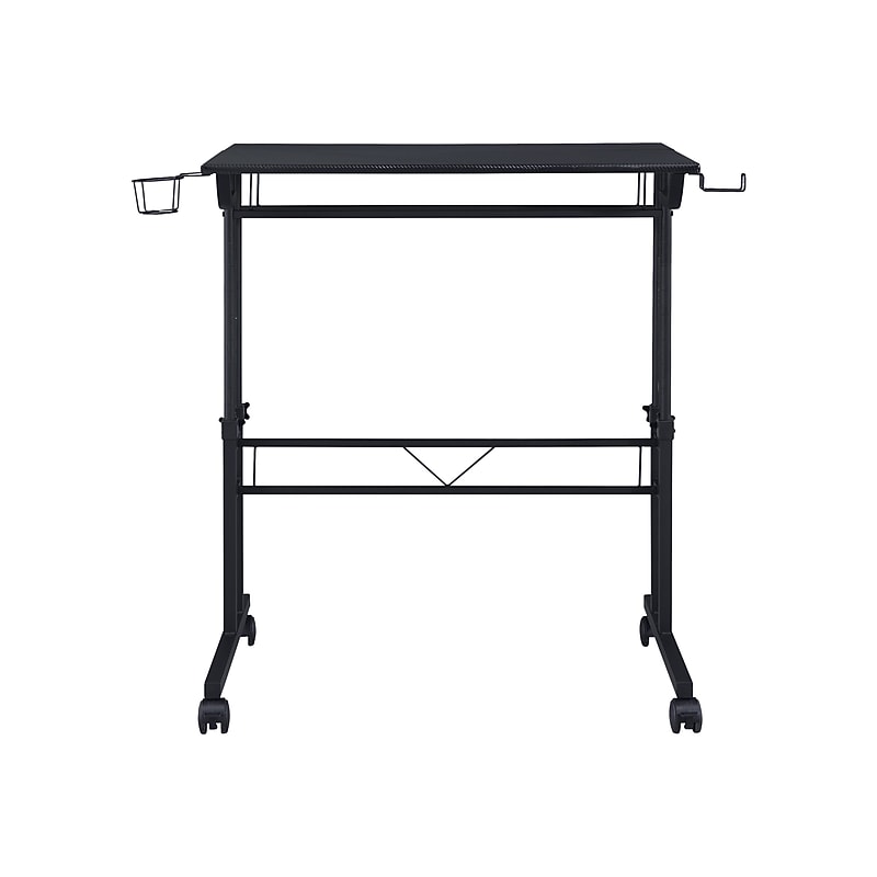 Mix industrial and modern styles together with this Techni Mobili rolling and adjustable writing desk. This desk is perfect for home office spaces with its small footprint. The finish coordinates with almost any decor while carbon fiber-like texture tabletop surface and powder-coated metal frame and legs give this desk a sturdy build along with a fun design. It includes front wheels with a locking mechanism that lets you swiftly glide in a home office space. The desktop is large enough to hold your laptop, notebooks, and office essentials while the other tabletop surface can be used as a riser to keep items within reach. It comes with integrated headphones and cup holders that can be easily installed on right and left. Plenty of space for multitasking with this mobile desk. Comes and made of particleboard. Dimensions: 40"H x 36"W x 25"D. Base is made of powder-coated metal for durability and strength. Modern furnishing style and rectangular writing desk. One shelf holds peripherals and office supplies. Assembly required. 5-year manufacturer limited warranty.