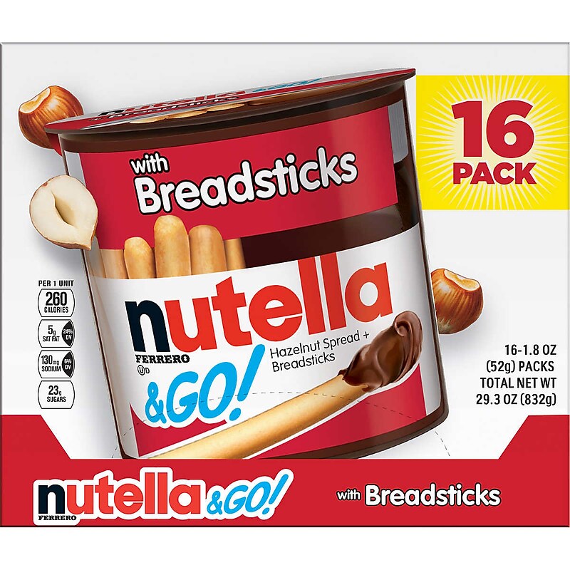 A 16 count pack of Nutella & Go Chocolate Hazelnut Dip with Breadsticks. Enjoy the great taste of Nutella Hazelnut spread with crunchy breadstick pieces to dip. The perfect chocolatey snack to pack in the kids lunches or grab for a snack on-the-go. Kosher Friendly and only 230 calories per pack. Buy in bulk and keep in the pantry or office break room for a tasty, chocolate hazelnut treat. A 16 count pack of Nutella & Go Chocolate Hazelnut Dip with Breadsticks. Enjoy the great taste of Nutella Hazelnut spread with crunchy breadstick pieces to dip. The perfect chocolatey snack to pack in the kids lunches or grab for a snack on-the-go. Kosher Friendly and only 230 calories per pack. Buy in bulk and keep in the pantry or office break room for a tasty, chocolate hazelnut treat. A 16 count pack of Nutella & Go Chocolate Hazelnut Dip with Breadsticks. Enjoy the great taste of Nutella Hazelnut spread with crunchy breadstick pieces to dip. Kosher Friendly and only 230 calories per pack. The perfect chocolatey snack to pack in the kids lunches or grab for a snack on-the-go.