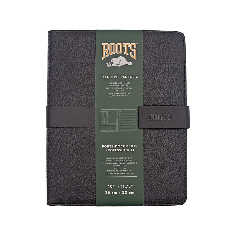 This ROOTS padfolio features credit card slots, pockets, ID windows, a paper pad, pen holder, and a calculator. It is slim, smartly designed, easily fits into a bag or briefcase and is very affordable. You will really enjoy using this item. Provides a slim and affordable solution to enhance your everyday organization and productivity.padfolio with soft-touch textured PU material. Dimensions: 11. 75"H x 10"W x 0. 79"D. Comes with four credit card slots, two slot pockets, two ID windows, one tab closure, one calculator, one paper pad slot, and one pen holder. Padfolio features magnetic tab closure. Features a contrast stitch. Calculator and paper pad included. 90-day manufacturer limited warranty.