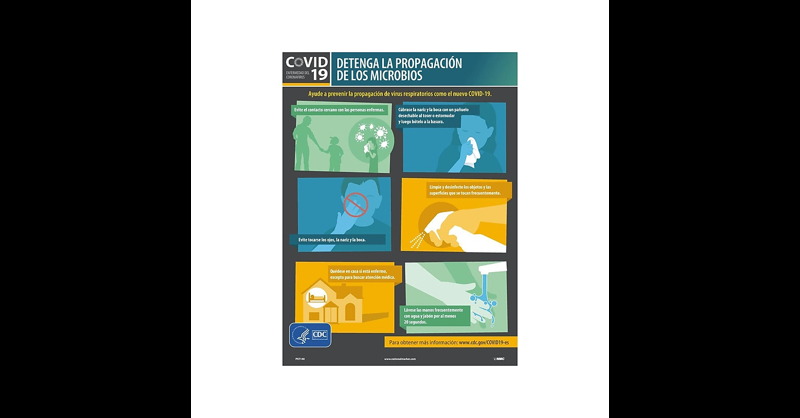 National Marker "Stop the Spread of Germs" COVID-19 poster helps remind employees and visitors to help mitigate the spread of harmful germs by taking the easiest of steps, such as washing hands and avoiding close contact with others. Includes information about steps you can take to avoid spreading respiratory diseases like coronavirus. Helps employees and visitors understand how to stop the spread of COVID-19. Dimensions: 18". Comes multicolored and made of PolyTag. Poster imprinted in Spanish. Meets or exceeds CDC standard.