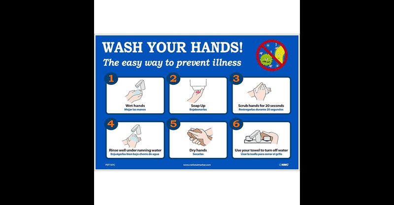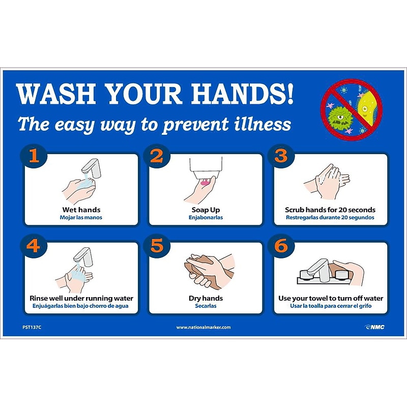 Remind your workforce to pause and take a moment to practice good hand hygiene with this National Marker "Wash Your Hands" poster. "Wash Your Hands" poster acts as a simple reminder to wash your hands regularly and walks you through the proper hand-washing steps. Remind your workforce to pause and take a moment to practice good hand hygiene. Dimensions: 18". Made and white of a chemical-resistant 0. 15" thick unrippable vinyl and is great for any industrial tag application. Poster imprinted in English.