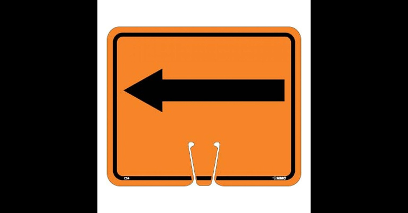 Create temporary directional signage with this National Marker cone top sign. Direct drivers to the left with this brightsign. The left arrow will convey the information at a simple glance. This single-view sign fits the cone top for better visibility while path guidance. Features black graphics onbackground. Safety cone left arrow sign for directional instruction. Used to create single-direction traffic flow. Dimensions: 10. 38" 12. 63". Made of plastic and comes inwith black graphics. Mounts to the cone top. Features graffiti-proof, UV- and chemical-resistant surface.