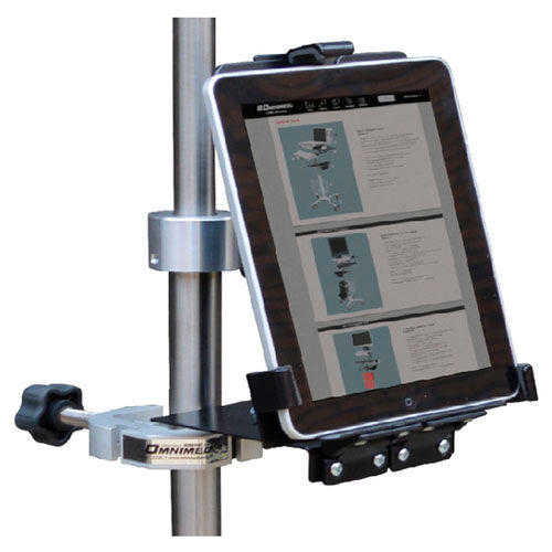 Omnimed's tablet carts are designed for security and convenience. They are perfect for telemedicine and documentation. The inner column can be adjusted to position the tablet at the perfect height. The inner column has our air glide design so it will slowly drift lower when the locking knob is released. The 741360 comes with 4 Ram Style IV hooks at the top of the unit. The tablet holder is attached to the column with Omni Clamping system that allows the tablet to be secured anywhere on the column. The unique tension hinged design of the tablet holder allows the operator to easily change the angle of view and the hinges ensure that the angle does not change. Mobile IV Cart Only. Tablet Not Included. Features: Stainless steel column design for durability and easy cleaning Air glide system controls descent of pole Holds up to four 3,000 cc containers Tablet holder accommodates tablets measuring from 6" to 12.25" wide, 6" to 12.25" high and .75" deep or less. Height adjustment of 4' 9" to 7' (5) 2.5" Dual wheel plastic casters - two locking and three non-locking Plastic Base 5-Year Warranty, 1-year on casters.
