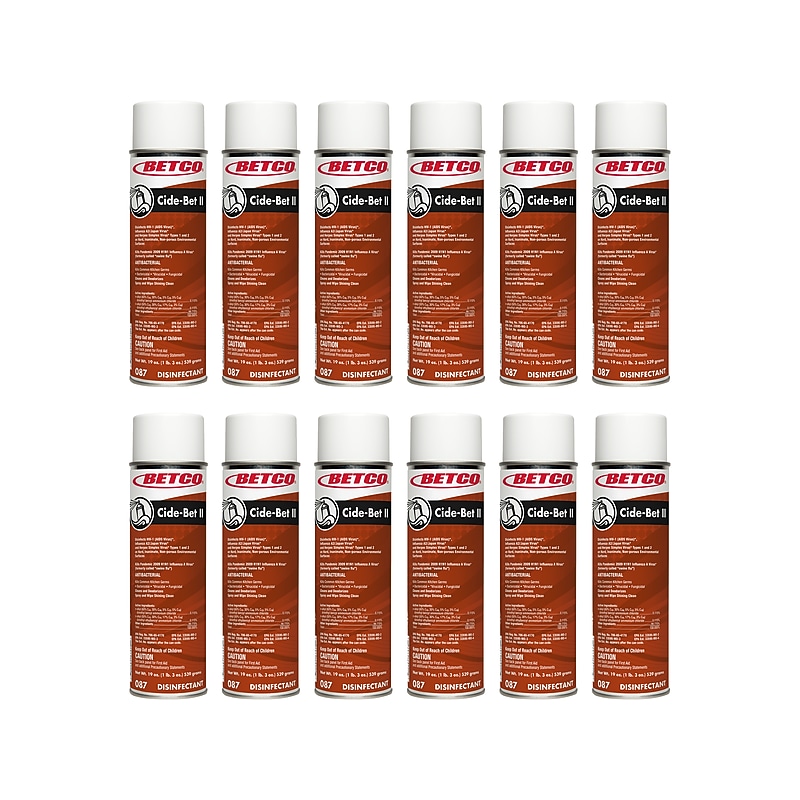 This Betco Cide-Bet II easy-to-use foaming germicidal detergent cleans, disinfects, and deodorizes in one quick operation. A hospital-type disinfectant, this product kills a broad range of microorganisms including staph, salmonella, and pseudomonas. Virucidal against HIV-1 (AIDS virus) and herpes simplex 1 and 2. Effective fungicidal activity against pathogenic fungi, mold, and mildew. Powerful detergent action quickly removes a wide variety of soils and will not harm most surfaces. This product destroys odors at their source, leaving a fresh and clean fragrance behind. Foaming disinfectant with pleasant floral fragrance cleans, disinfects, and deodorizes in one quick operation. Active ingredients: alkyl dimethylbenzyl ammonium chloride, alkyl dimethyl ethylbenzyl ammonium chloride, butoxyethanol, tetrasodium EDTA, isopropanol, propane. Can size: oz. Meets or exceeds EPA, OSHA, NIOSH, ACGIH standards. Deodorizes and eliminates all malodors at their source. Easy way to clean, disinfect, and deodorize: spray and wipe clean. Cleans and disinfects without scouring or scratching. Kills HIV-1 on pre-cleaned environmental surfaces previously soiled with blood/body fluids and a broad range of microorganisms including staph, salmonella, and pseudomonas. Active pH: 11. 5-12. 5. Product is flammable. 1-year manufacturer limited warranty. ⚠ WARNING: California Proposition 65 Warning. This product can expose you to chemicals including lead, which are known to the State of California to cause cancer and birth defects or other reproductive harm. For more information go to www. P65Warnings. ca. gov Safety Data Sheet.