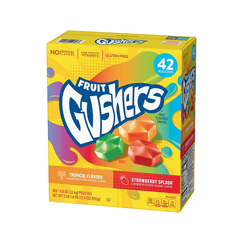 Look forward to lunchtime with the Betty Crocker Fruit Gushers fruit-flavored snacks. Naturally flavored, these gummy treats are easy to pack in lunch boxes and enjoy on the go. Gummy snacks are bursting with fruit flavors. This variety pack includes Strawberry Splash and tropical flavors. It provides a good source of vitamin C and just 80 calories per pouch. Free of artificial flavors and gluten. Gummy snacks with Strawberry Splash and tropical fruit flavors. Kosher pareve, gluten-free, and free of artificial flavors. Capacity: 33. 6 oz. Serving size: one pouch. Variety pack includes 42 pouches. Good source of vitamin C. Ingredients: sugar, corn syrup, dried corn syrup, pear puree concentrate, modified corn starch, fructose, maltodextrin, palm oil; contains 2% or less of: cottonseed oil, glycerin, grape juice concentrate, carrageenan, citric acid, monoglycerides, sodium citrate, malic acid, vitamin C (ascorbic acid), natural flavor, potassium citrate, agaragar, xanthan gum. Contains bioengineered food ingredients. To avoid choking, give snacks only to children who can easily swallow chewy food. Ready to eat. Keep in a dry cool place.