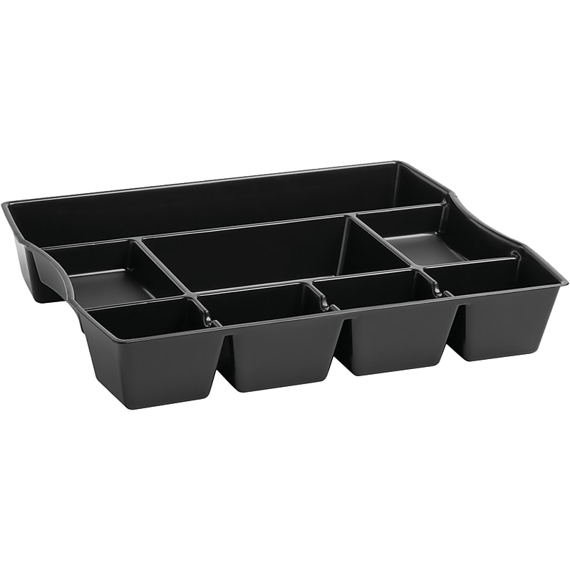 It's always good to have that extra storage for your home or office. This Rubbermaid drawer tray provides you with a space for easy organization of your work supplies. Equipped with eight compartments to fit pens, pencils, paper clips, staples, sticky notes, and other small office supplies. Made with 25% post-consumer recycled plastic. Drawer organizer is great for easy organization of your work supplies. Equipped with eight compartments to fit pens, pencils, paper clips, scissors, staples, sticky notes, and other small office supplies. Made with 25% post-consumer recycled plastic and comes Dimensions: 2. 5"H x 14. 88"W x 11. 88"D. Two shallow compartments provide easy access to small items. Center compartment fits 3" x 3" sticky note pads. Large compartment fits a 12" ruler. Weight: 0. 79 lbs.