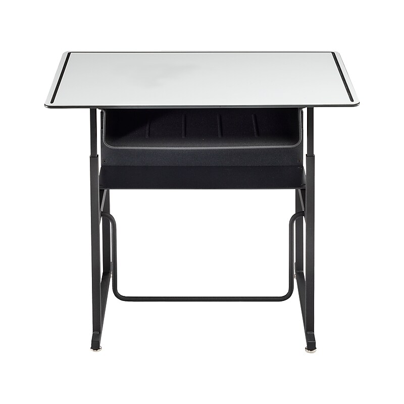 Safco AlphaBetter is an adjustable-height stand-up student desk with swinging footrest (fidget bar). Patented Swinging Pendulum footrest bar allows students to redirect excess energy and engage in continuous motion that may help support ergonomic comfort and cardiovascular health, while potentially increasing calorie burn, productivity, and focus. The desktop is large enough to accommodate laptops, textbooks, and supplies for project learning. The desk features adjustable nylon base levelers for stabilization and easy movement across smooth and carpeted floors. Phenolic resin open shelf provides easily accessible storage area for school supplies and personal items. Adjustable stand-up student desk offers a large work surface for big projects. Made with premium, durable, industrial-grade phenolic resin, features laminated plastic desktop and steel base with black powder-coated finish for durability. Adjustable height ranging from to 42. 25". Dimensions: 43. 88"H x 35. 75"W x 23. 75"D. Weight capacity: 50 lbs. Meets or exceeds GSA, CPSIA, GREENGUARD standards. Assembly required. Premium dry-erase top for students to work on projects or solve problems. Patented Swinging Pendulum footrest bar allows students to redirect excess energy and engage in continuous motion that may help support ergonomic comfort and cardiovascular health. Includes steel book box (4. 75"H x 22"W x 15"D) for storing classroom materials. Adjustable nylon base levelers for stabilization and easy movement across smooth and carpeted floors. Phenolic resin open shelf provides easily accessible storage area for school supplies and personal items. Lifetime manufacturer limited warranty; 5-year warranty on polymer-based components, user-adjustable work surface mechanisms, components that are either moving parts or controls.
