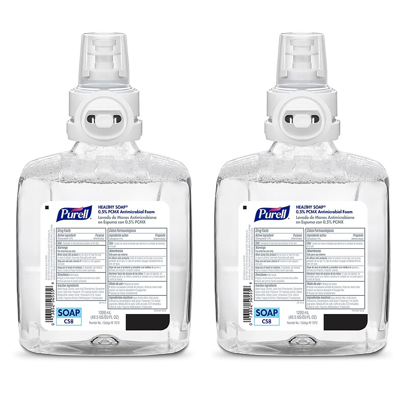 PURELL HEALTHY SOAP 0. 5% PCMX Foam is a specially formulated hand soap that effectively reduces germs on skin. The high-quality, rich foam helps kill common bacteria found in healthcare environments. The formula is dye free with a pleasant floral fragrance. These mL refills for CS8 Automatic Hand Sanitizer Dispensers (SKUs 7830-01 and 7834-01; sold separately) are designed for cost and labor savings, including integrated Energy-on-the-Refill technology that eliminates the need to replace batteries. Each refill has a factory-sealed nozzle to help eliminate the risk of contamination. It also features a removable pump for easier recycling. Effectively reduce germs with PURELL HEALTHY SOAP Foam from the most trusted brand in hospitals. 1. PURELL HEALTHY SOAP 0. 5% PCMX Foam features 0. 5% PCMX antimicrobial to kill common bacteria found in healthcare environments. High-quality, rich foam formulation is dye-free and gentle enough for frequent use. Features a pleasant floral fragrance. Each refill comes with Energy-on-the-Refill technology that eliminates the need to replace batteries and a factory-sealed nozzle that helps eliminate the risk of contamination. Case includes: 2 PURELL HEALTHY SOAP 0. 5% PCMX Foam mL refills for CS8 automatic soap dispenser. CS8 dispensers (7830-01 and 7834-01) are sold separately. A certified Women-Owned Business manufactures this product. Safety Data Sheet . Effectively reduce germs on skin with this specially formulated PURELL HEALTHY SOAP 0. 5% PCMX Foam handwash.