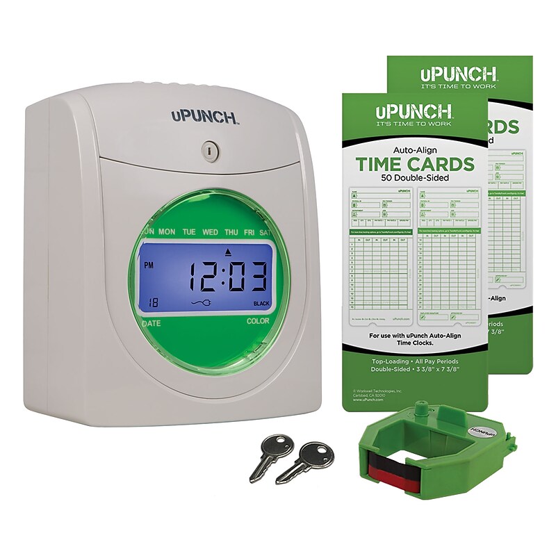 Introducing a time clock unlike any other. While most punch card time clocks do only one thing - track in and out punches, uPunch does more by eliminating double punching with an automatic card feed and computerized alignment. You can even calculate hours worked directly on the time card with the Calculating uPunch. Tracking your employees' time just got easier. Easy printing: insert the card in the top slot and the time clock will automatically position it. LCD helps you keep track of time by showing the time and date. Employees use printable time cards. Dimensions: 11. 25"H x 11. 5"W x 12"D. Package includes: 100 cards, two keys, and one ribbon. 2-year manufacturer limited warranty. ⚠ WARNING: Cancer and Reproductive Harm - www. P65Warnings. ca. gov.