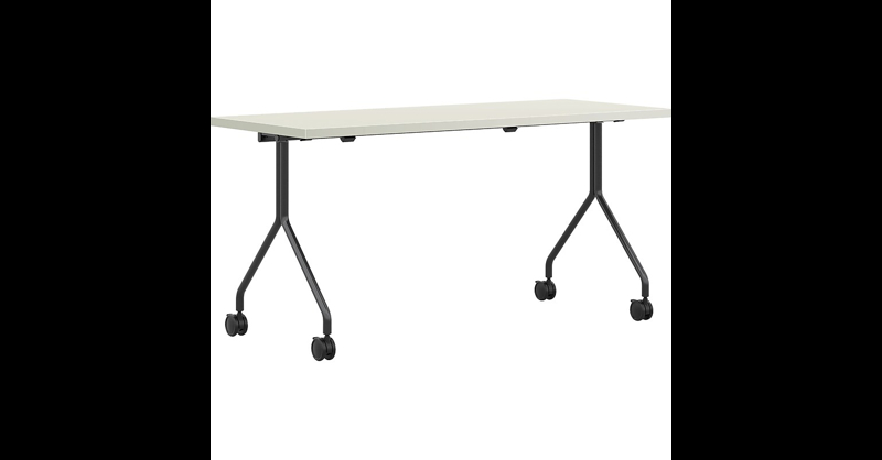 Outfit your change-of-pace settings like cafs, break rooms, and breakout spaces with a Between nesting table, to give people a chance to connect with colleagues or chill by themselves. Order one model, get both the top and base included. The 24"D 48"W worksurface is made of scratch-, spill- and stain-resistant laminate capable of supporting up to four people. The sturdy base flips the worksurface vertically, which allows the tables it to neatly nest together with other Between nesting tables to save space when not in use. Laminate finish isMesh. The bottom of the table is black and the top has a silver mesh high-pressure laminate (HPL) finish. Rectangle worksurface gives up to four people space to collaborate. Dimensions: 29"H 48"L 24"D. Base flips the worksurface vertically to nest with other tables to save space. Table and base are bundled together, order one SKU - get both. 1. 125" thick worksurface provides a sturdy foundation for work. Scratch-, spill-, and stain-resistant laminate stands up to heavy use. Durable 2mm edgeband provides a smooth, comfortable edge. Dual-wheeled caster configuration. Meets or exceeds ISTA standards. 5-year manufacturer limited warranty. Model Option: HMPT2448NS. N. B9LOFT. P71.