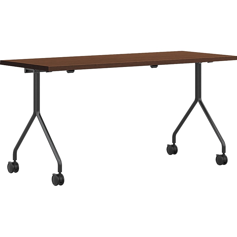 Outfit your change-of-pace settings like cafes, break rooms, and breakout spaces with this HON Between nesting table to give people a chance to connect with colleagues or chill by themselves. The work surface is made of scratch-, spill- and stain-resistant laminate capable of supporting up to four people. The sturdy base flips the work surface vertically, which allows it to neatly nest with other Between nesting tables to save space when not in use. Table bottom is black and the high-pressure laminate (HPL) top has afinish. Work surface gives up to four people space to collaborate. Rectangular table measures 29"H 48"L 30"D. Base flips the work surface vertically to nest with other tables to save space. Table and base are bundled together, order one SKU and get both. 1. 13" thick work surface provides a sturdy foundation for work. Scratch-, spill- and stain-resistant laminate stands up to heavy use. Durable edge band provides a smooth, comfortable edge. Dual-wheeled casters. Meets or exceeds ISTA standards. 5-year manufacturer limited warranty. Model Option: HMPT3048NS. N. FF. P71.