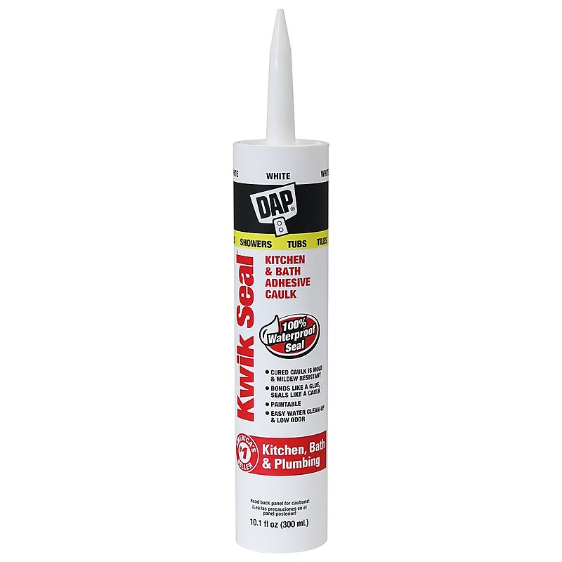 DAP KWIK SEAL kitchen & bath adhesive model 7079870798 provides excellent adhesion and flexibility for a durable seal around sinks, tubs, showers, faucets, vanities, counter tops and fixtures. Adheres to ceramic and plastic tile, glass, porcelain, fiberglass, wood, metal, plaster and drywall. Seals like a caulk, bonds like an adhesive. 100% waterproof kitchen and bath adhesive caulk. Low odor and easy water clean up. Shower ready in 48 hours. Resists cracking, crumbling and shrinking. Applies white and dries clear in 7-14 days. 10. 1 White. ⚠ WARNING: Cancer - www. P65Warnings. ca. gov. DAP KWIK SEAL kitchen and bath adhesive caulk provides 100% waterproof seal that is mold and mildew resistant.