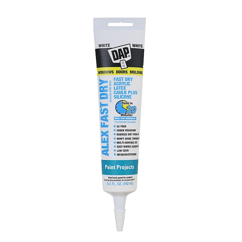 DAP ALEX FAST DRY ALL PURPOSE ACRYLIC LATEX CAULK PLUS SILICONE model 707918408 is a durable, flexible caulk resists cracking, dirt pickup and paint glossing. It applies smoothly and easily, has outstanding adhesion to a wide variety of surfaces and provides a 100% waterproof seal. Can be brush painted 20 minutes after application or spray painted immediately, so the job gets finished faster. Low odor and easy water clean-up. Cured caulk is mold and mildew resistant. Interior/exterior use. Exceeds ASTM C834. 5. 5 White. ⚠ WARNING: This product can expose you to chemicals known to the State of California to cause cancer. For more information, go to: www. P65Warnings. ca. gov. Specifically formulated to meet the demanding needs of Professional Painters and deliver outstanding paint finish results.