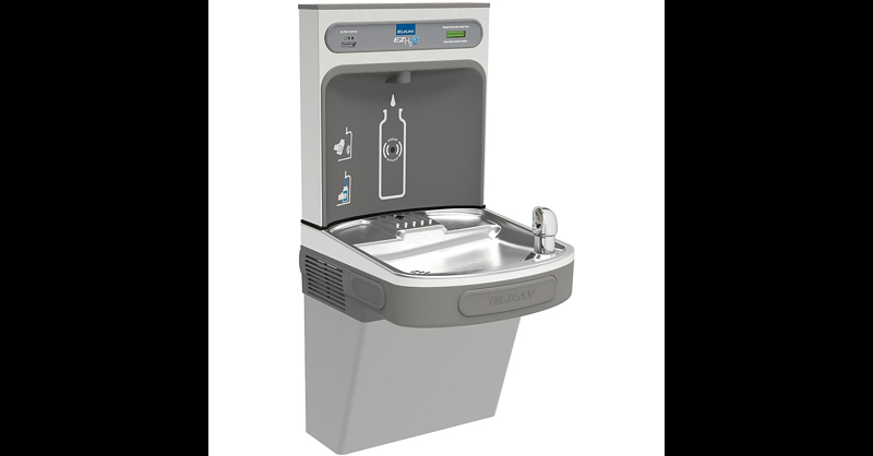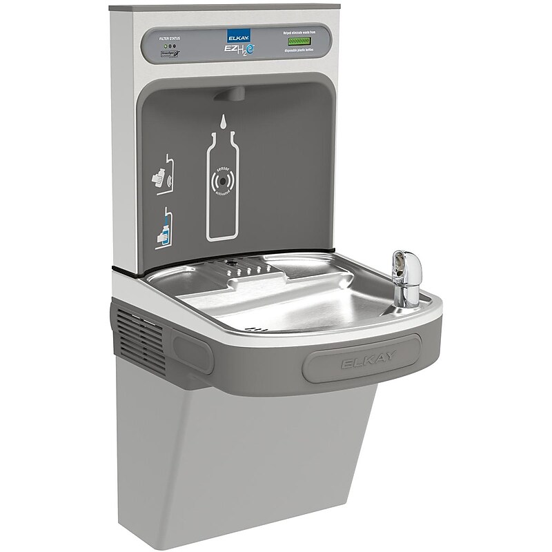 The Elkay EZH2O Bottle Filling Station delivers a clean quick water bottle fill and enhances sustainability by minimizing our dependency on disposable plastic bottles. Complete cooler and bottle filling station in a consolidated space saving ADA compliant design. Bottle Filler features sanitary no-touch sensor activation with automatic 20-second shut-off timer. Touchless, sensor activation (bottle filler) designed for easy use; easy-to-operate push-bar activation (bubbler). Fill rate is 1. 1 GPM. Visual filter monitor with LED filter status indicator for when filter change is necessary. The 3,000-gallon filter is certified to NSF 42 and 53 for lead, Class 1 particulate, chlorine, taste and odor reduction. Green Ticker informs user of number of 20 oz plastic water bottles saved from waste. Laminar flow provides clean fill with minimal splash. Silver ion antimicrobial protection on key plastic components to inhibit the growth of mold and mildew on product. Real drain system eliminates standing water. Vandal-resistant bubblers feature chrome-plated integral hood guard to prevent contamination from other users, airborne deposits and tampering. Compressor included in refrigerated units.
