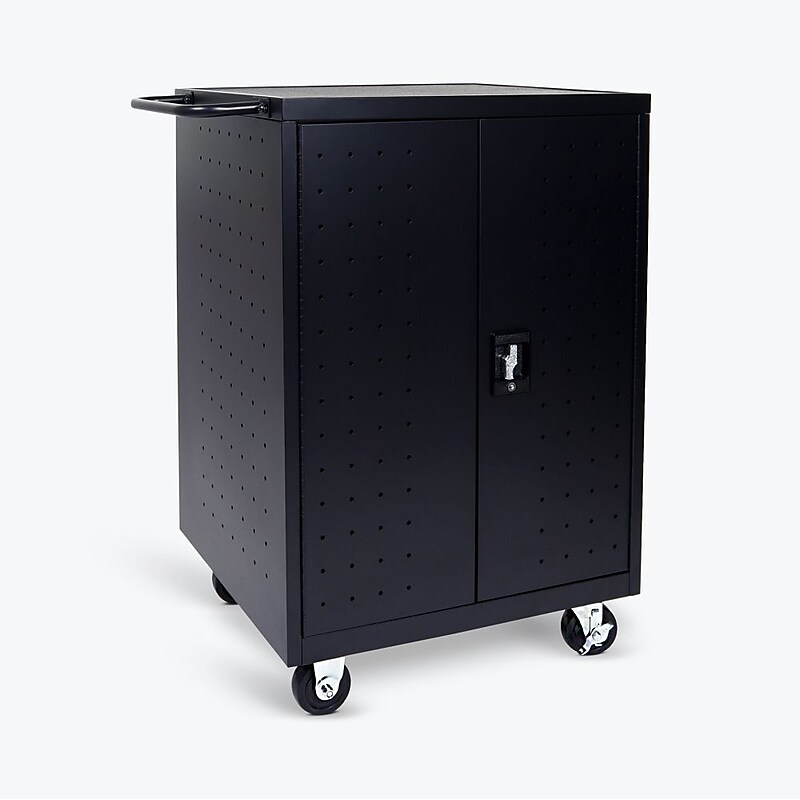 Functionality meets durability with a Luxor Laptop / Chromebook Charging Cart. Charges, stores and transports up to 24 laptops or Chromebooks (12 per shelf). Overall (w/handle): 31. 125"W x 21. 125"D x 40. 125"H. Rubber-coated dividers safeguard devices from damage. Bottom storage shelf for storing additional IT items. Locking front and rear access doors; includes two keys. All-steel construction and padded top surface. Ventilated on all four sides, allowing air to circulate freely through the unit. Four 4" casters, two with locking brakes, for easy maneuverability and stability. Includes two UL-Listed 12-outlet 120V/15A vertical electrical power strips. Maximum weight capacity of 175 lbs. (evenly distributed). Shelves: 26"W x 15. 25"D with 10"H of top clearance. Divider Slots: 1. 75"W. Cord Length: 10 feet.