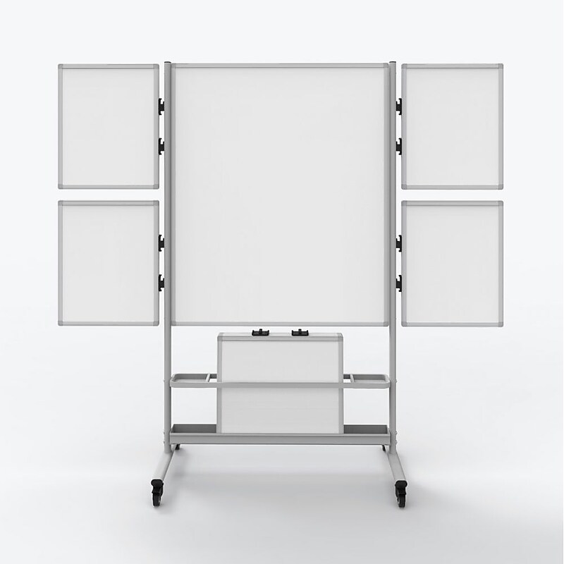 Transform your business or classroom into an interactive workspace with the Luxor Collaboration Station, a double-sided mobile magnetic whiteboard with four attachable marker boards. Designed to create a productive work environment where teammates can interact and share ideas, this mobile whiteboards surface area is easily extended by attaching four small whiteboards to connectors on the sturdy steel frame. The double-sided small boards can be used individually and when not in use, are conveniently stored in the built-in storage tray. Whether visualizing ideas on the large whiteboard or with all five boards joined together, or using individual boards for group interaction, the Collaboration Station is the perfect tool to inspire innovation and creativity. Large magnetic whiteboard with four attachable small whiteboards. ABS plastic connector clips allow smaller whiteboards to easily attach and remain secure. Two-sided whiteboards double the writing surface. Painted steel surface resists ghosting and provides excellent erasability. Magnetic whiteboard surface allows for hanging of documents and more. Powder-coated steel frame provides strength and durability. Four 2. 5" casters, two with locking brake, provide easy mobility. Dual-purpose marker tray supports four small dry erase boards and holds markers and erasers. Overall: 82. 25"W x 23. 7"D x 76. 4"H. Large Board: 40. 4"W x 48. 6"H. Small Boards: 18. 75"W x 23. 3"H.