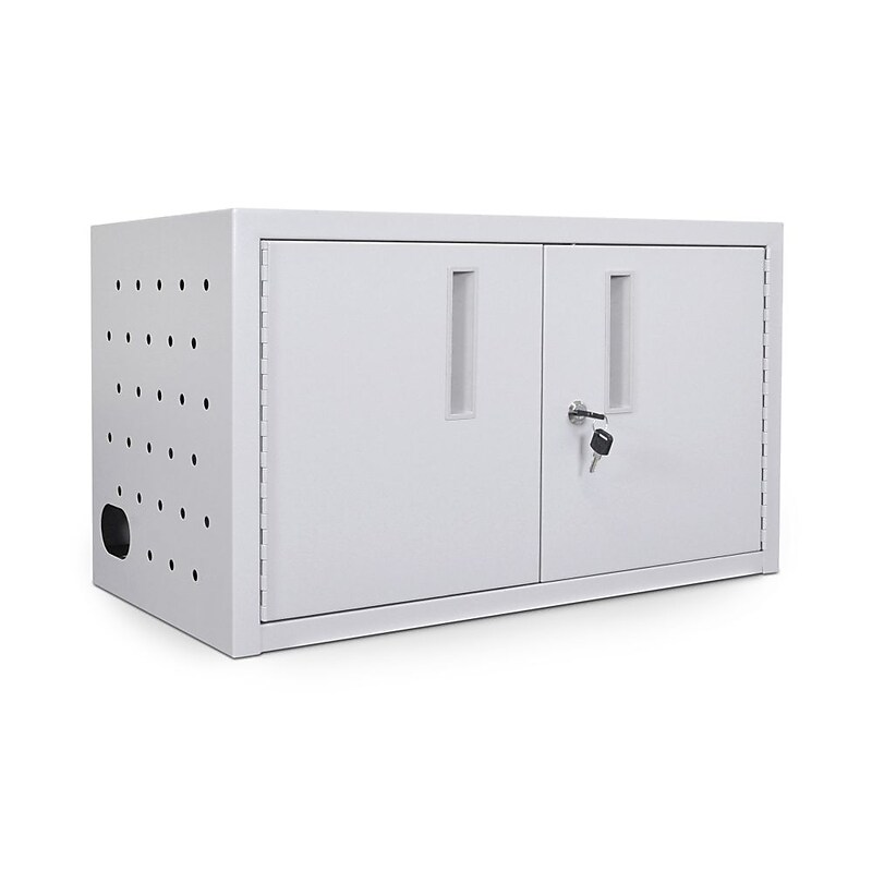 Perfect for small offices, classrooms and libraries, Luxor Wall / Desk Tablet Charging Cabinets provide a strong, simple design that's reliably secure yet affordably priced. Charges, stores and transports up to 16 tablets. Overall: 25"W x 13"D x 14. 5"H. Charging station can be mounted to a wall or sit on any flat surface. Padded interior with rubber-coated dividers safeguards devices from damage. Secure key-lock; includes two keys. All-steel construction. Ventilated sides allow constant airflow to avoid overheating. Includes UL-Listed 16-outlet 120V/15A horizontal electrical power strip. Arrives assembled; includes drywall-mounting hardware. Maximum weight capacity of 70 lbs. (evenly distributed). Meets ANSI/BIFMA Standards. Divider Slots: 1"W x 11. 75"D with 13. 25"H of top clearance. Cord Length: 10 feet.
