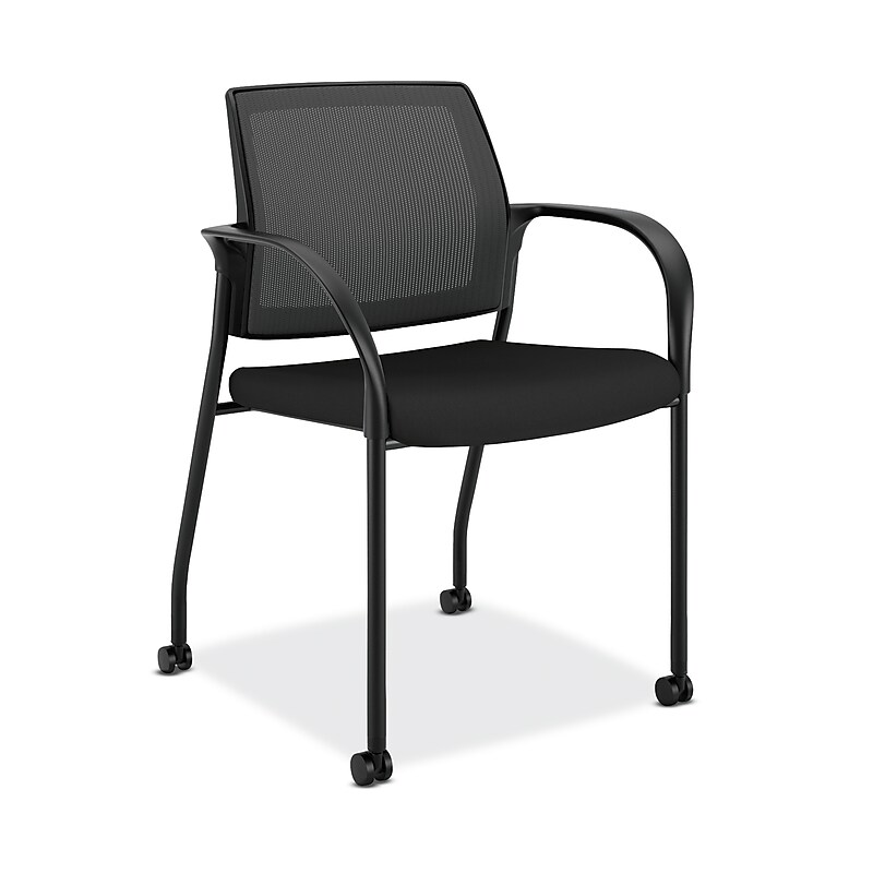 HON Ignition Mesh/Fabric Multi-Purpose Stacking Chair, 4-Leg, Fixed Arms,(HONIS107HIMCU10). Stacking.Fabric. Overall Dimensions: 34. 0 - 34. 0"H x 25. 0"W x 21. 75"D. Seat Size: 18. 0"W x 17. 0"D Back Size: 18. 0"H x 18. 0"W. Fixed Arms.Plastic Five-Star base. Warranted for users up to 300 pounds. Fully Assembled. Meets or Exceeds ANSI/BIFMA Standards. ilira-stretch mesh back, seat fabric and frame colors are Black. Contoured, breathable ilira-stretch mesh back increases airflow and enhances support. Fixed arms provide upper body support. Chairs stack four high on the floor to save valuable space. Wall-saver leg design prevents damage to walls or cabinets. Casters roll quietly and effortlessly on all floor types. Warranted for users up to 300 lbs. Backed by the HON Full Lifetime Warranty. Model Option: HIGS6. F. H. IM. CU10. T.