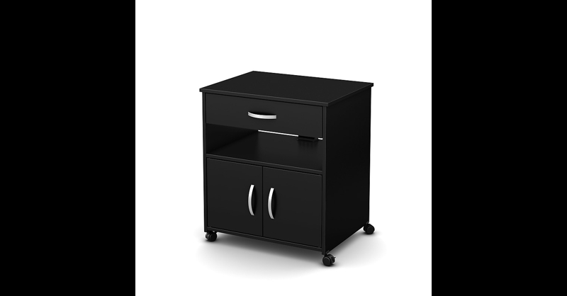 This microwave cart was designed to give you the extra storage space you need to solve the problem of kitchen clutter. This compact yet functional piece on casters can easily hold your microwave, recipe books, and kitchen accessories so it frees up counter space. The drawer ideal for storing spices, utensils, or even paper is great for keeping those little things we want out of sight but within easy reach.finish, laminate. 27. 25"H x 26"W x 19. 75"D. Metal handles with a satin nickel finish. Built-in brakes on two of the casters, so it can be moved around safely. Behind the doors: 2 storage spaces separated by 1 adjustable shelf that can hold up to 15 lb. Cable grip for keeping cords together. 1 drawer, for optimum storage. Metal drawer slides. Meets or exceeds all North American safety standards. Accessories not included. Requires complete assembly by 2 adults (tools not included). Packaging tested and certified to reduce the risk of damage during shipment. Made in North America with non-toxic laminated particleboard. 5-year quality guarantee. ⚠ WARNING: This product can expose you to chemicals including formaldehyde, which is known to the State of California to cause cancer or birth defects or other reproductive harm. For more information go to www. P65Warnings. ca. gov/furniture.