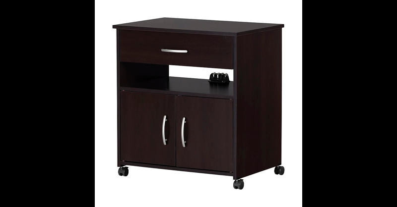 This microwave cart was designed to give you the extra storage space you need to solve the problem of kitchen clutter. This compact yet functional piece on casters can easily hold your microwave, recipe books, and kitchen accessories so it frees up counter space. The drawer ideal for storing spices, utensils, or even paper is great for keeping those little things we want out of sight but within easy reach.finish, laminate. 27. 25"H x 26"W x 19. 75"D. Metal handles with a satin nickel finish. Built-in brakes on two of the casters, so it can be moved around safely. Behind the doors: 2 storage spaces separated by 1 adjustable shelf that can hold up to 15 lb. Cable grip for keeping cords together. 1 drawer, for optimum storage. Metal drawer slides. Meets or exceeds all North American safety standards. Accessories not included. Requires complete assembly by 2 adults (tools not included). Packaging tested and certified to reduce the risk of damage during shipment. Made in North America with non-toxic laminated particleboard. 5-year quality guarantee. ⚠ WARNING: This product can expose you to chemicals including formaldehyde, which is known to the State of California to cause cancer or birth defects or other reproductive harm. For more information go to www. P65Warnings. ca. gov/furniture.