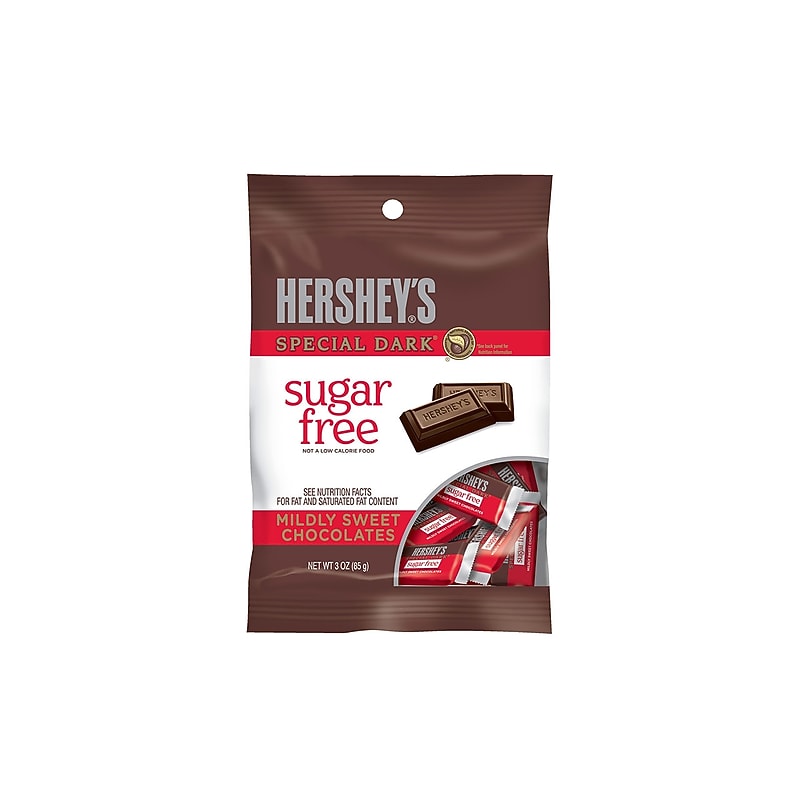 Savor the perfectly balanced, decadently dark taste of Hershey's Special Dark Chocolate Bars - without the sugar. These 3-ounce bags make it easy to keep sugar-free treats within reach. Use them for baking sugar-free desserts or delighting friends and loved ones who have special dietary needs. At only 30 calories a piece, these bars let everyone feel good about enjoying Hershey's Special Dark Chocolate. Hershey's Special Dark Mildly Sweet Chocolate bars in the sugar-free variety. Sugar-free, perfect for special dietary needs. Individually wrapped miniature 45 percent cacao dark chocolate bars. Individually wrapped miniature 45 percent cacao dark chocolate bars. Sugar-free, perfect for special dietary needs. Please Note: This product may require special packaging to protect against temperature issues. Some deliveries may experience a slight shipping delay.