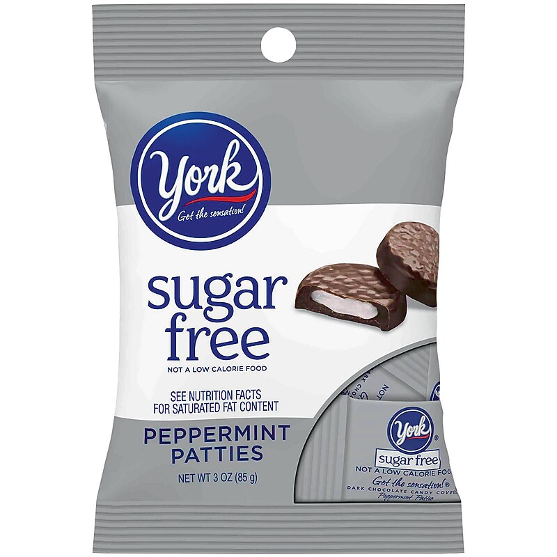 Get the sensation but not the sugar. York Sugar Free Peppermint Patties are the perfect sugar-free candy for enjoying classic chocolate covered mints at home, on the go, or even in sweet recipes for sugar free desserts. York Peppermint Patties are a cool treat whether you're at home, at work, or on the go. Refreshing peppermint and smooth dark chocolate. Please Note: This product may require special packaging to protect against temperature issues. Some deliveries may experience a slight shipping delay. Individually wrapped York Sugar Free Peppermint Patties in classic silver wrappers.