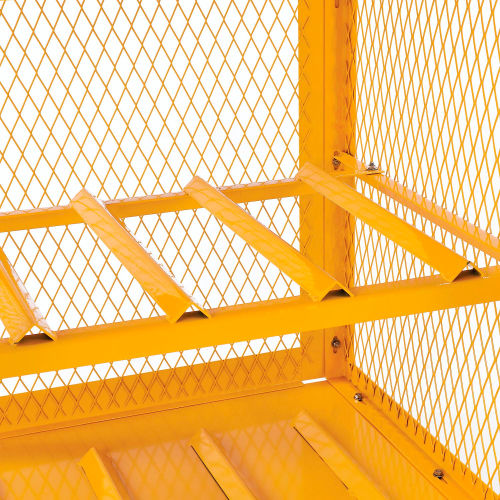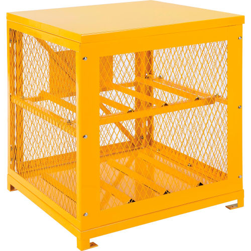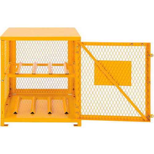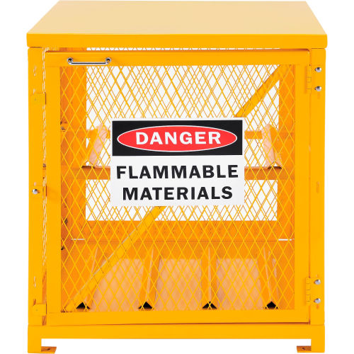 Cylinder Storage Cabinet Single Door Horizontal, 4 Cylinder Capacity, Assembled Cylinder Storage Cabinets are made of solid 14 gauge steel top and bottom for strength. Features 1/8"x1-3/16" expanded metal door(s) and sides which allow for ventilation and visibility of contents. Rust and acid resistant safety yellow powder coat finish for long lasting durability. Padlock hasp keeps contents secure for safety storing compressed air/gas cylinders and tanks. (padlock not included). Magnetic catches keep doors safely shut when not locked. Cabinet will accept 20 lb and 33 lb LPG cylinders. "DANGER FLAMMABLE MATERIALS" sign is located on the door(s). Pre-punched lagging holes in feet for anchoring to the ground. Comply with OSHA regulation 1910.110. Ships fully assembled, ready to use.