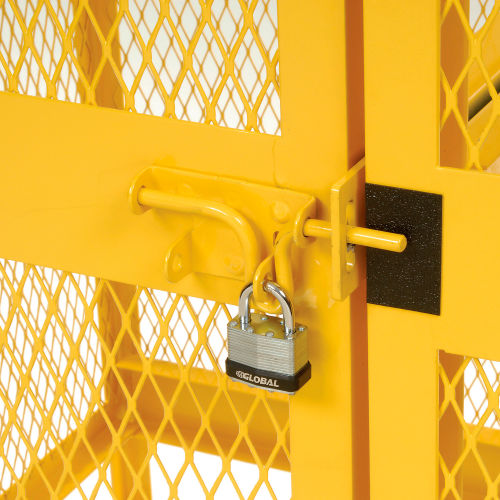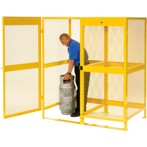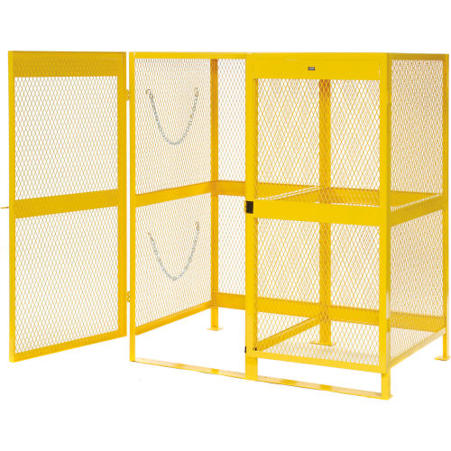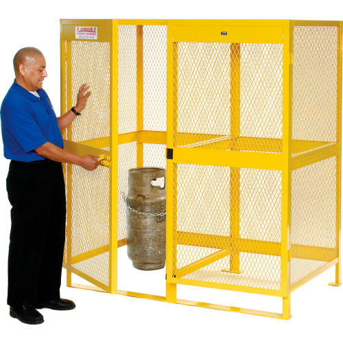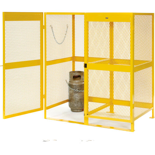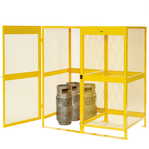 Global Vertical Cylinder Storage Cabinet Painted Assembled 20 Cylinder Capacity This painted cylinder storage cabinet consists of a 12-gauge roof, 13-gauge expanded metal body, angle iron framing and all-welded construction for maximum strength and rigidity to protect your cylinders from unauthorized handling. Ruggedly built cabinets provide efficient, compact storage indoors and out. Heavy-duty construction, highly visible Flammables warning sign and a padlock hasp (lock not included) for security. Exceeds OSHA 1910.110 requirements and NFPA standard #58-79. Yellow powder coat finish. Ships assembled, ready to use. 1 Year Limited Warranty.