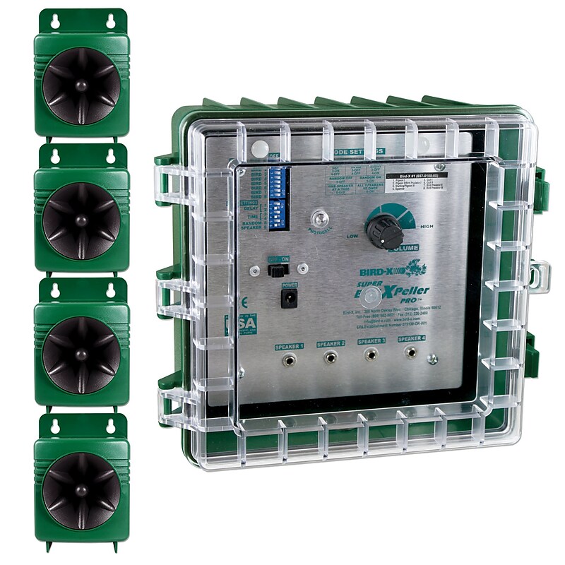 Keep birds away with the Super Bird-X Peller Pro Sonic Deterrent which broadcasts pre-recorded bird alarm calls and predator cries. This unit helps control birds outdoors with its sophisticated sonic technology. The Super Bird-X Peller is fully-programmable. You control the volume, how often it goes off and when it goes off. This unit is used to deter pigeons, starlings, sparrows, and seagulls and it can cover up to 6 acres. Sonic emits audible sounds that deter birds. Natural sounds uses high-quality digital playback of naturally recorded bird distress signals, bird alarm calls, and predator cries. Fully programmable you control sounds, volume, interval, & day/night operation. Installs easily mounting hardware included. Recommended for outdoor use. Protects up to 6 acres. Weatherproof to withstand the environmental rigors of outdoor use. Included: Control unit, 4 speakers with cords, 100 feet of wire per speaker, AC adapter with 6ft cord. Sound Pressure: 105110 db. at 1 meter. Speakers: 8 ohms, 75 watts. Sound Pressure: 95102 dB (each speaker) at 1 meter. Dimensions: Control Unit 9 x 9 x 5, Speakers 4 x 4 x 6. Super Bird-X Peller Pro gets rid of birds by emitting a variety of naturally recorded distress and predator calls.