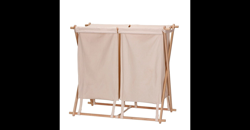 Sort, store, and haul laundry in HOUSEHOLD ESSENTIALS X-Frame Wood Double Laundry Hamper Sorter, a large capacity double clothes hamper that holds approximately 4 loads of laundry! This spacious 2-bag hamper sorter simplifies laundry day by pre-sorting laundry. 2 polycotton canvas bags hang on the 30 inch wide frame. Each cream colored bag, with drape lid that lays over the top of each side of the laundry sorter, hooks onto the raw wood X-frame. The bags latch on with fabric loops and then secure with additional hook and loop fasteners. The removable bags are machine washable with like colors (line dry), making it easy to haul dirty laundry out of the hamper (bag and all), and then wash everything (bag included!). The unfinished frame can be stained or painted to match your space, making this double hamper sorter a versatile addition to your laundry routine. Perfect for homes and shared living spaces! The X-Frame Wood Double Laundry Hamper Sorter is 30 inches tall, 30 inches wide, and 17 inches deep. Space-saving clothes sorter holds approx. 4 loads of laundry and folds up when empty. Sturdy, unstained rubber wood frame: can be painted for stained to match your space!. 4. 15''H x 17''W x 30''D. 2 large removable polycotton laundry bags: Wash cold with like colors and air dry. Easy, no-tools assembly. Attached drape-over lid covers dirty clothes and laundry. 1-year manufacturer's warranty.