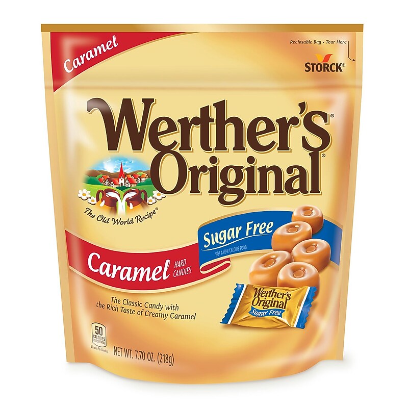 Fill up your candy jar with these mouthwatering Werther's hard candies. Werther's Original Sugar Free Caramel Hard Candy comes with a 2-Pack filled with silky, smooth caramel candies. These individually wrapped, German-made caramels have 40% fewer calories than regular Werther's Caramels. Looking for a satisfying treat with rich caramel taste? This Werther's 2-Pack is exactly what you need!. A 2-Pack of 7. 7-Ounce pouches of Werther's Original Sugar Free Caramel Hard Candies. The classic candy with the rich taste of creamy caramel. Perfect for the candy jar at work, or for enjoying in the car, or on the go.